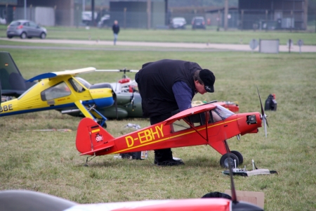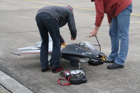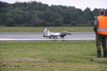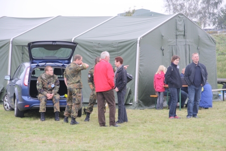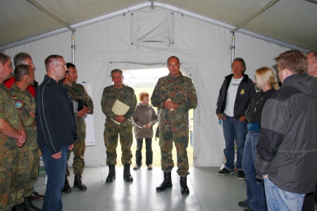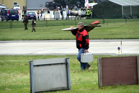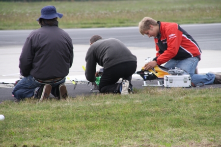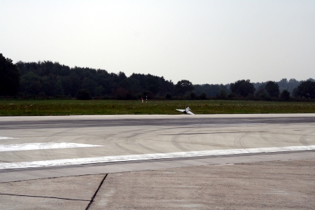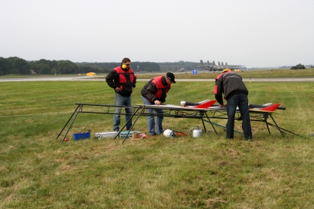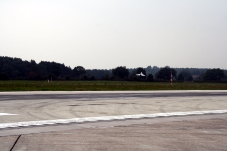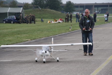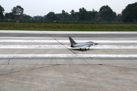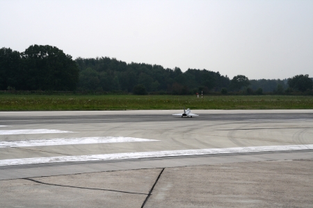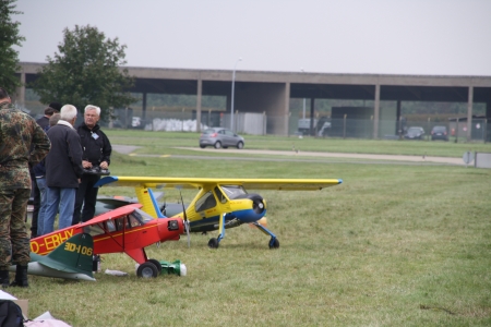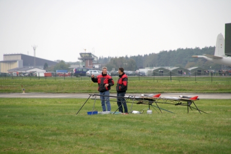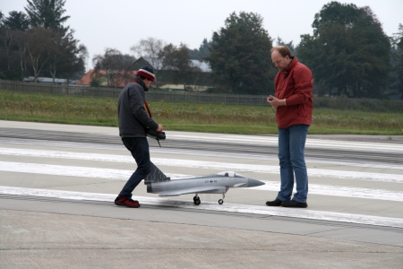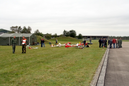 Der Tag fing mit einem Briefing an, welches unser Mitglied Michael Falk und Soldat beim LTG 63 hielt und es wurde ein kleiner Programmablauf festgelegt zu welchen Zeiten die Modelle vorgeflogen werden sollten. Michael hat außerdem für die Versorgung der Piloten und Gäste gesorgt. Der Wettergott hatte Erbamen und bescherte uns, bis auf einen kleinen Nieselschauer absolut fliegbares Wetter, die Windverhältnisse spielten auch mit. Ganz neu für viele der Piloten, war auf so einem großen Flugplatz zu fliegen und vor allem auf einer Hartpiste zu starten und zu landen. Es gab aber keine nennenswerten Probleme bei den Piloten. Nur ein kleines Manko war der immense Reifenverschleiß, da die Start und Landebahn mit einem so genanten Anti-Skid-Belag versehen ist, der in der groben Richtung einer Oberfläche eines 30`ziger Sandpapieres gleicht.