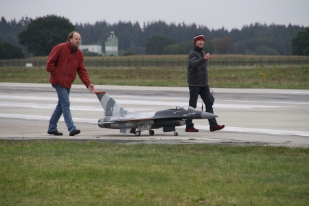 Andi Buchholz mit seiner F16 Andi kam vom MFC Kropp zur Unterstützung und flog seine F16 sehr gekonnt vor. Meist hatte man das Gefühl welch eine Freude Andi hatte, endlich einmal auf so einem großen Gelände weiträumig zu fliegen und vor allem auf einer richtigen Hartpiste zu starten und landen |