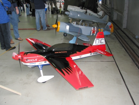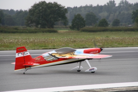 Wolfgang Hinkerode vom MFC Kropp zeigte uns sehr gekonnten Kunstflug mit seiner Raven. Es gab sogar Einlagen mit Rauch. Die Raven hatte eine beachtliche Größe und einen 4.Zlinder Boxermotor mit über 200ccm eingebaut. |